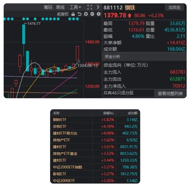 值得注意的是,钢铁板块今天为节后首次显著异动。钢铁ETF也在ETF市场中涨幅居首,此外农牧、建材、地产等主题ETF也涨幅居前。